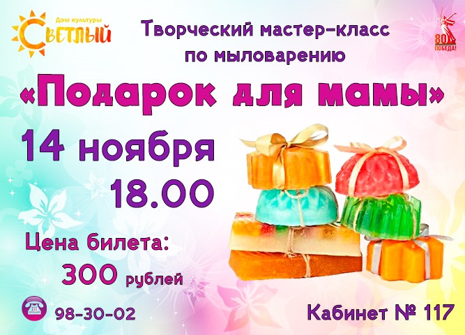 В пятницу, 27 ноября, в 18:30 малом зале «ДК «Светлый» состоится веселая семейная игра «Мама и Я!», посвященная международному Дню Матери. Мероприятие проходит по принципу огромной настольной игры с кубиком. Команды будут составлять мамы с детьми. Они соревнуются в ответах на сложные и шуточные вопросы, в творческих заданиях. Украшением игры станут выступления вокальных и хореографических коллективов «ДК «Светлый». Ответы и полноту выполнения заданий оценивает жюри по 5 бальной шкале. Победители получают памятные призы, а все без исключения получают сладкие подарки и заряд веселья и бодрости.