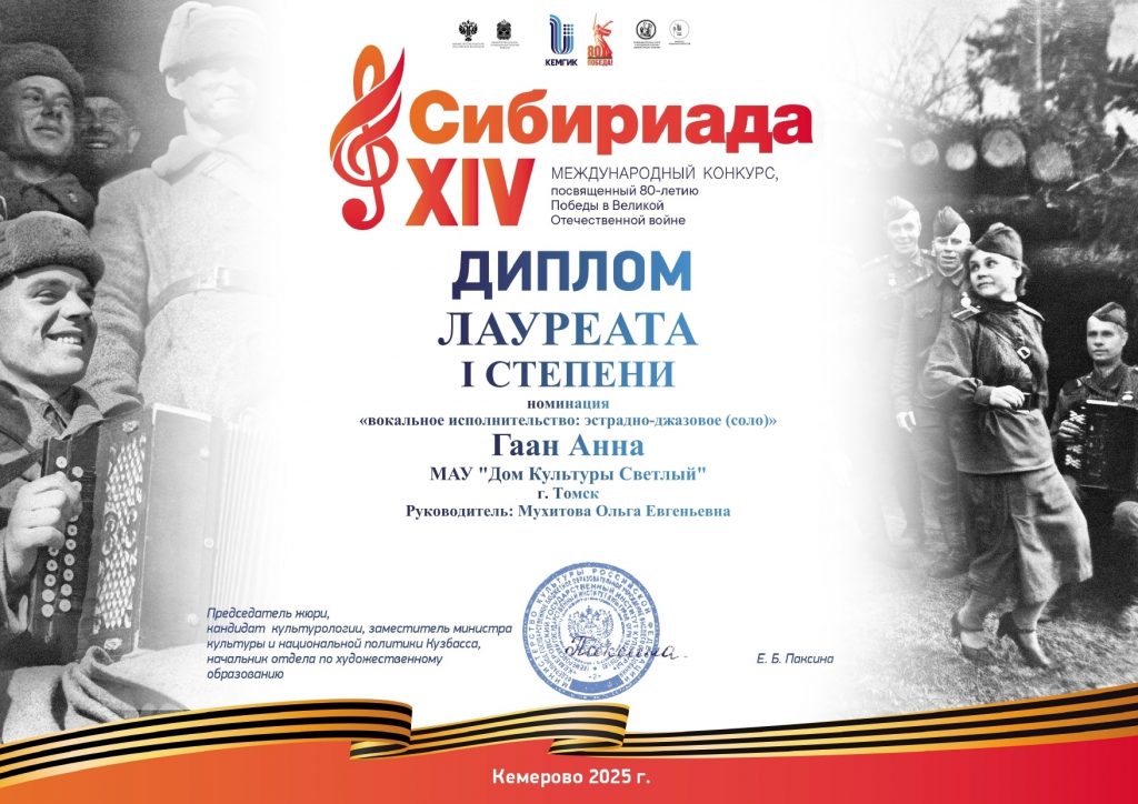 Руководитель клубного формирования и ее воспитанница приняли участие в XIV Международном конкурсе «Сибириада». Творческий конкурс собрал более 4 тысяч участников (солисты, коллективы) в вокальном и инструментальном жанрах, став одним из крупнейших культурных событий региона.